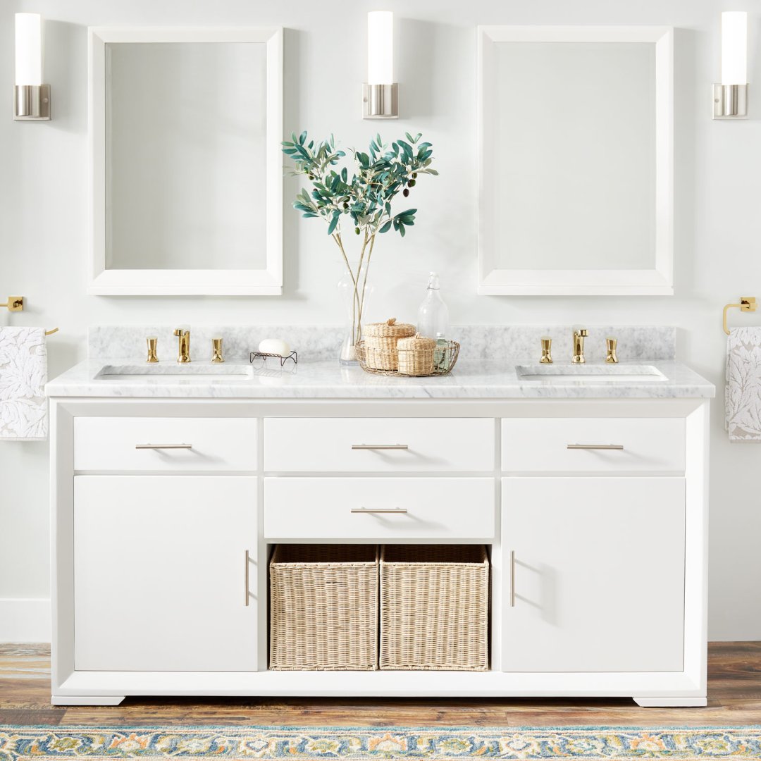 60" Robertson Double Vanity for Rectangular Undermount ... from i.pinimg.com A double sink vanity can look something like this: The large rectangular shape guards against untoward splashing, and the undermount installation means it's. Heavy and very solidly built and the carvings and hardware match perfectly to oil rubbed bronze fixtures and mirrors. Up top, the carrara marble counter comes with a backsplash and two rectangular undermount sinks. Double sink bathroom vanity cabinets are often mounted one above the other with space left for towels (and bottle traps) between. Shop menards where you will always save big money. 71 regent double sink vanity. Double sink vanities are regal, helpful, and completely practical.